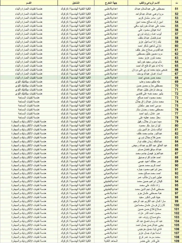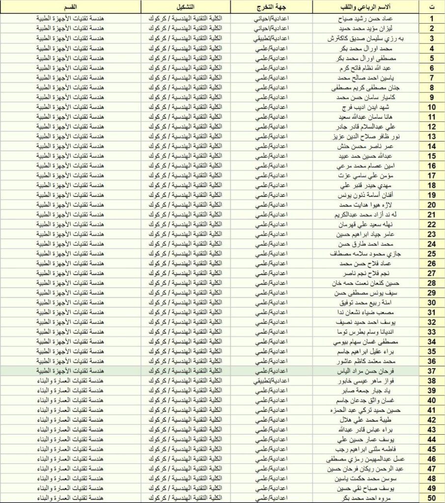تُعلن الكلية التقنية الهندسية / كركوك عن صدور نتائج القبول الأولي (الوجبة الأولى) لخريجي الدراسة الإعدادية المهنية المتقدمين إلى الدراسة المسائية في أقسام الكلية، وفقاً للرغبة الأولى وحسب القوائم المرفقة.